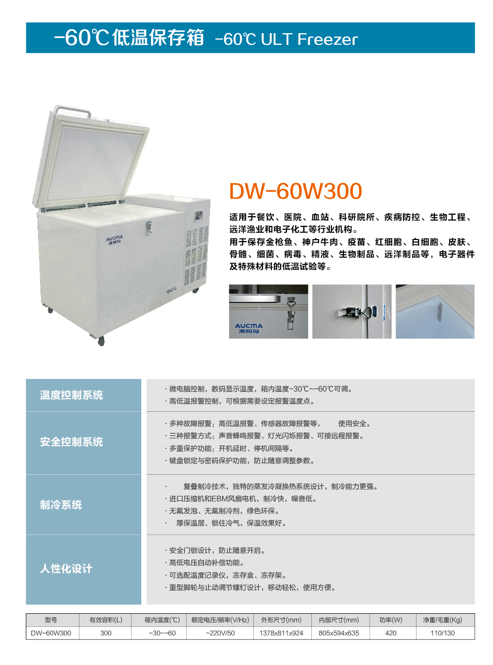 澳柯瑪DW-60W300 300升-60度低溫冷柜 臥式超低溫冷凍冰箱