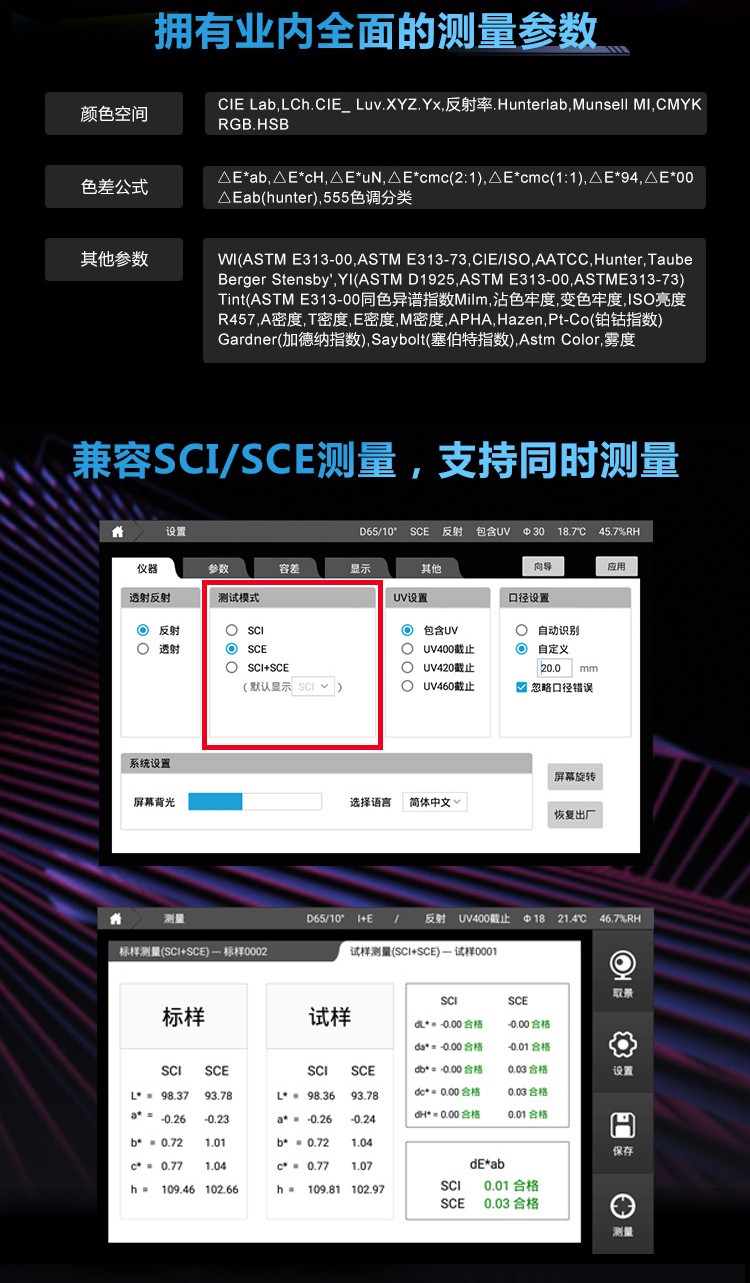 | 色差公式 | ΔE*ab,ΔE*CH,ΔE*uv,ΔE*cmc,ΔE*94,ΔE*00,ΔEab(Hunter),555色調(diào)分類 |