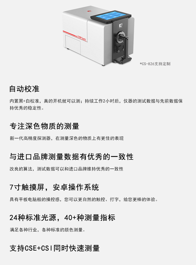 高精度臺(tái)式分光測(cè)色儀CS-826是一款高精度、高穩(wěn)定性的顏色測(cè)量?jī)x器;先進(jìn)的工藝技術(shù),強(qiáng)大的數(shù)據(jù)處理器,讓CS-826在黑色物體的顏色測(cè)量上具有優(yōu)秀的表現(xiàn);儀器的自動(dòng)校準(zhǔn),保證了長(zhǎng)期測(cè)量的穩(wěn)定性;改善的照明光源,在測(cè)量熒光和可見光上都有驚艷的展現(xiàn),且儀器測(cè)量數(shù)據(jù)能與進(jìn)口品牌維持優(yōu)秀的一致性。