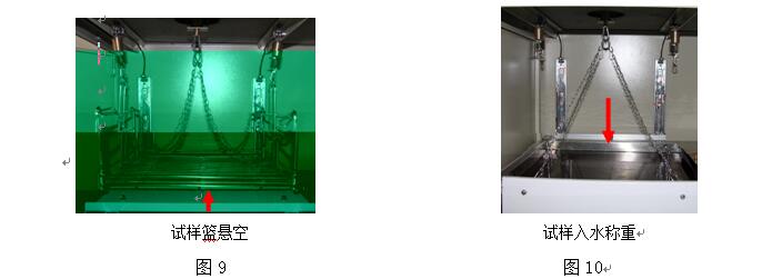 2、將網(wǎng)籃掛上電子天平的底掛鉤,關(guān)閉循環(huán)開關(guān),待電子天平讀數(shù)穩(wěn)定后按電子天平的“去皮”鍵,天平顯示為“0.0”,把試件放入網(wǎng)籃中浸水(3~5)min,讀取水中質(zhì)量(mw)。