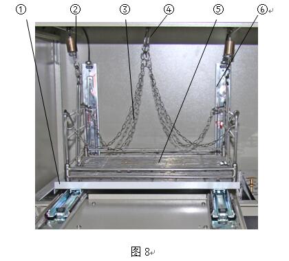 ⑵ 推動(dòng)上活動(dòng)托板,讓車轍試件置于電子天平正下方,將方形網(wǎng)籃上的2個(gè)帶不銹鋼鏈子的S形掛鉤掛在電子天平下方的保險(xiǎn)掛鉤上,見圖8。
